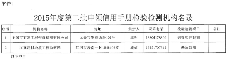 據(jù)悉,無錫市建設工程安全監(jiān)督站發(fā)出錫建安監(jiān)【2015】24號文“關于公布2015年度無錫市第二批申領建設工程安全類檢驗檢測機構信用手冊名錄的通知”。 為加強我市建設工程安全類檢驗檢測的管理,根據(jù)《無錫市建設工程安全類檢驗檢測機構信用管理辦法》,經各檢測機構自主申報,市安監(jiān)站組織對2015年度申報的第二批建設工程安全類檢驗檢測機構進行了資料核查,將經核查符合條件的建設工程安全類檢驗檢測機構名錄予以公布。